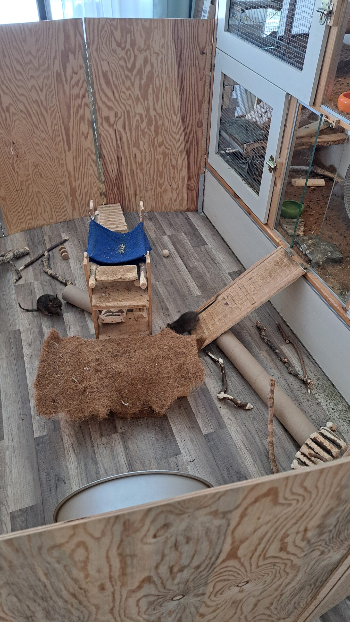 Sie sind gerne in den Laufrädern und den Holzelementen unterwegs, besonders gern auch in der Hängematte. Sie haben im Moment zwei Heizsteine, eine UV-Lampe, ein großes Laufrad von der Laufradschmiede und unter anderem eine Buddelzone sowie mehrere Sandbäder. Eine hölzerne Transportbox für etwaige Tierarztbesuche, wie auch Futter von Hansemanns können ebenfalls mit abgegeben werden.