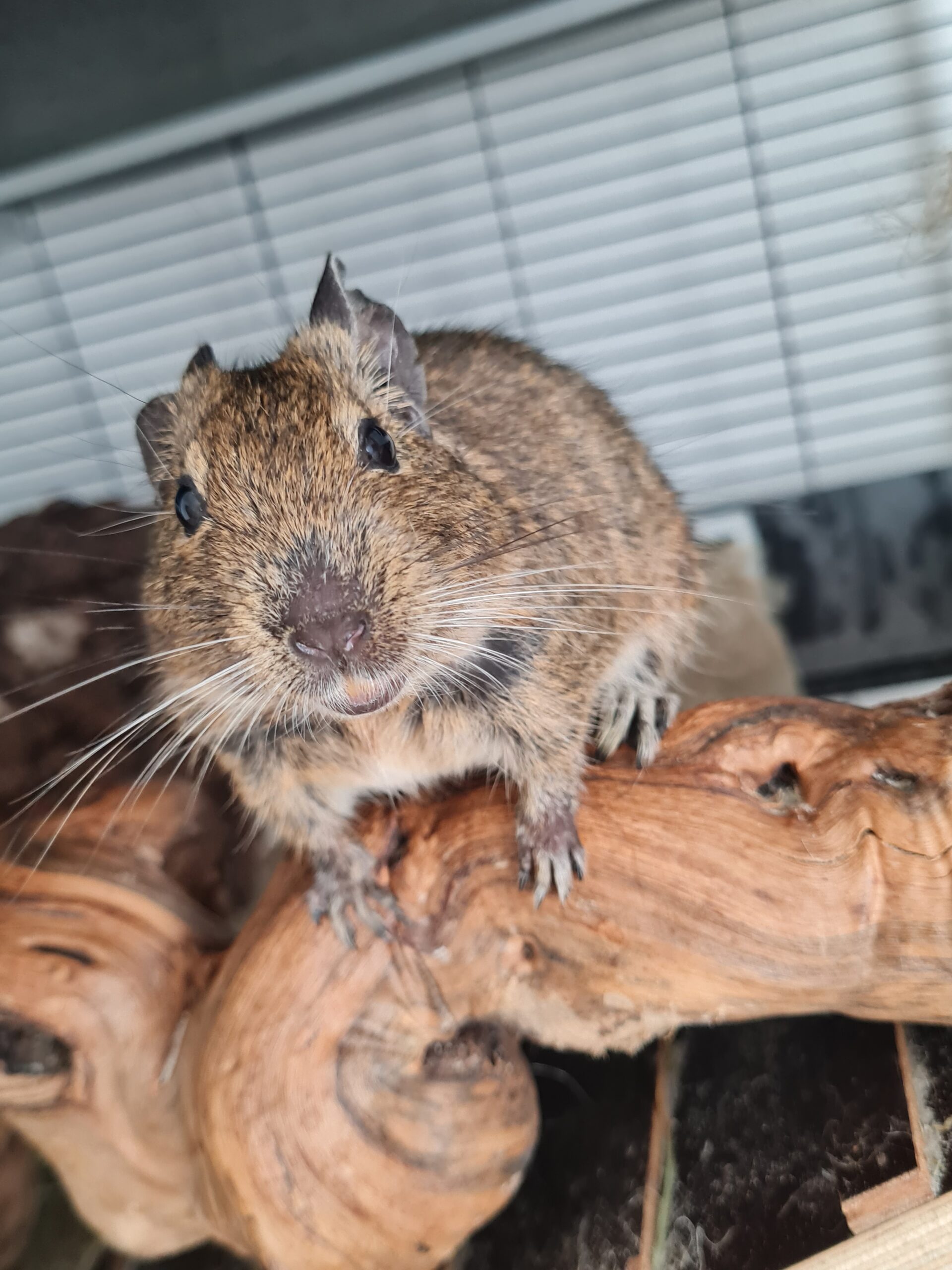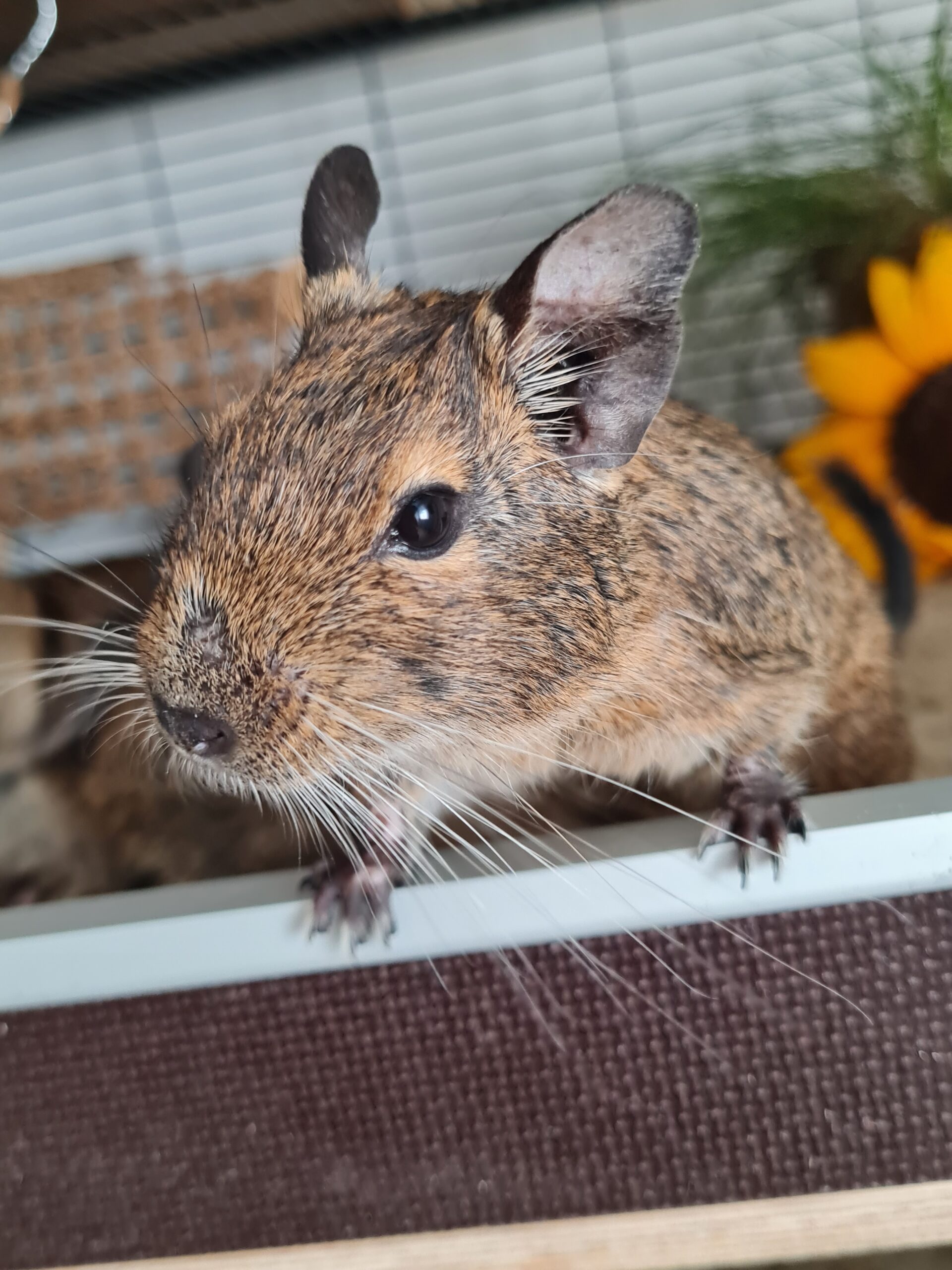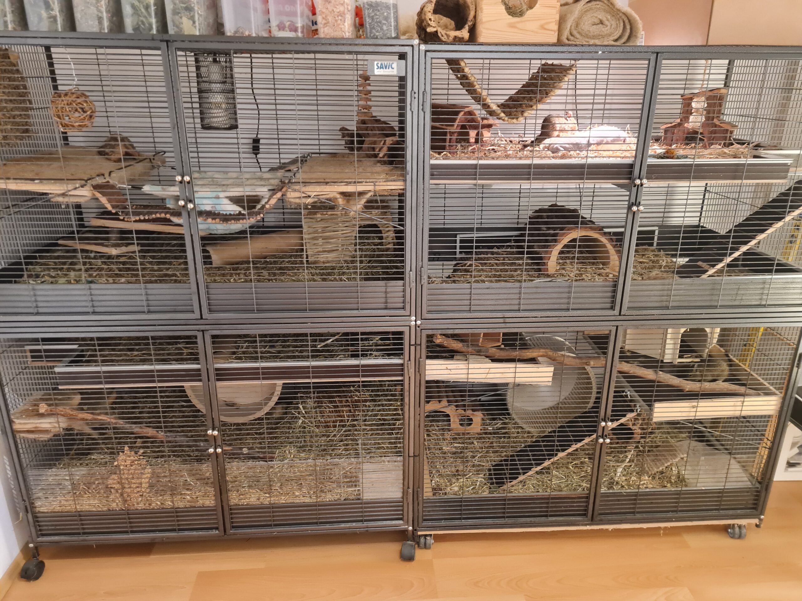Leider suchen wir aus persönlichen Gründen ein neues Zuhause für die drei. Der Käfig kann auch dazu genommen werden. Dieser besteht aus zwei Savic Royal Suite XL Käfigen die zusammen gebaut wurden. Innen wurde auch Degu gerecht ausgebaut. Dieser kann auch zerlegt werden für den Transport.