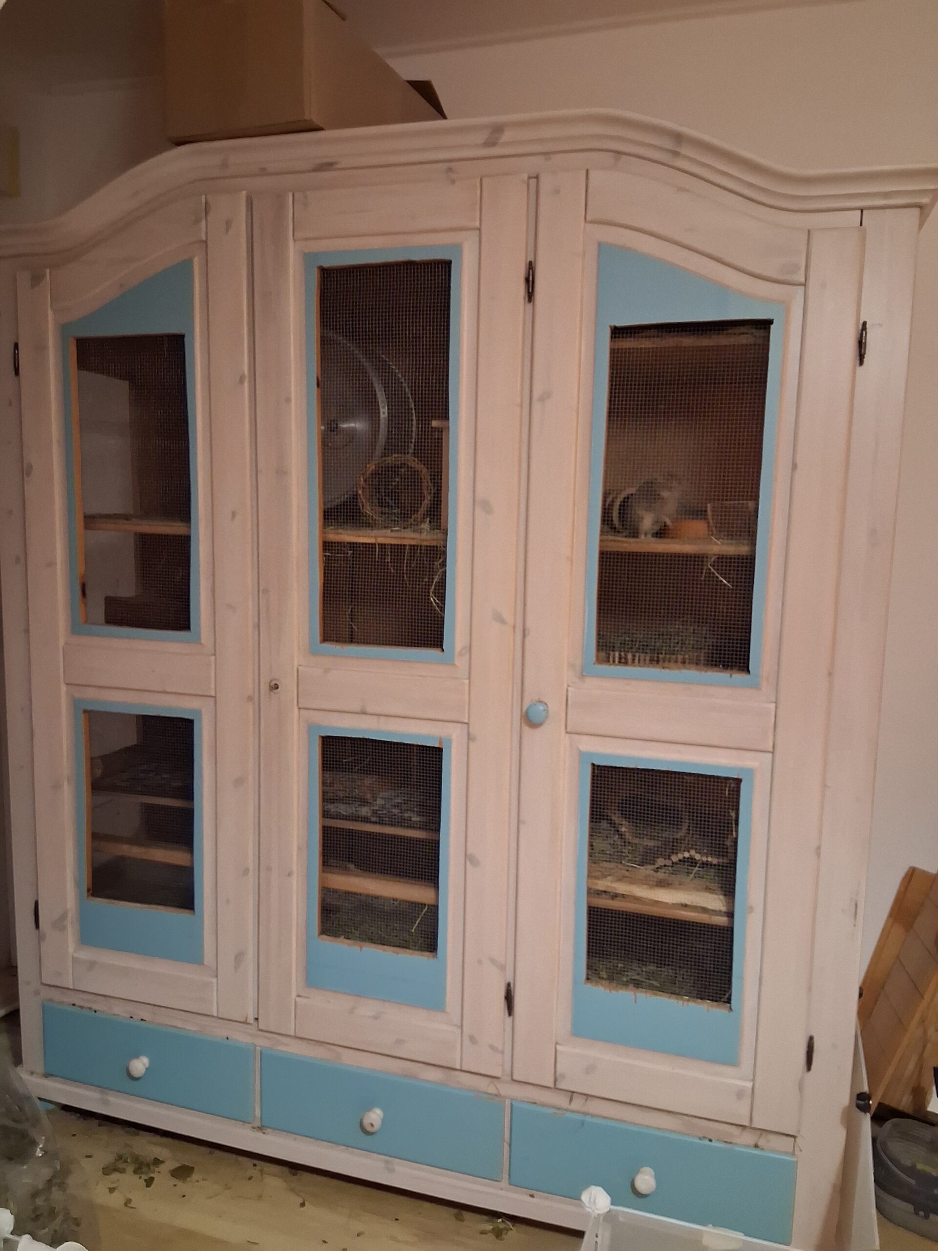 Mein Käfig ist 160 cm x 60 cm x 180 cm (L x B x H) groß. Aufgrund des Bogens ist er letztendlich ca. 2m hoch. Um meinen Schrank herum hab ich ein Außengehege.