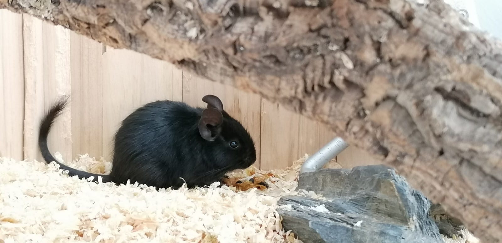 Ich bin Maki, ein kohlrabenschwarzes Degumädchen, 3 Jahre jung und ein wahres Energiebündel! Zurzeit bin ich leider alleine, weil meine liebe Adoptiv-Mama vor kurzem über die Regenbogenbrücke gehüpft ist.