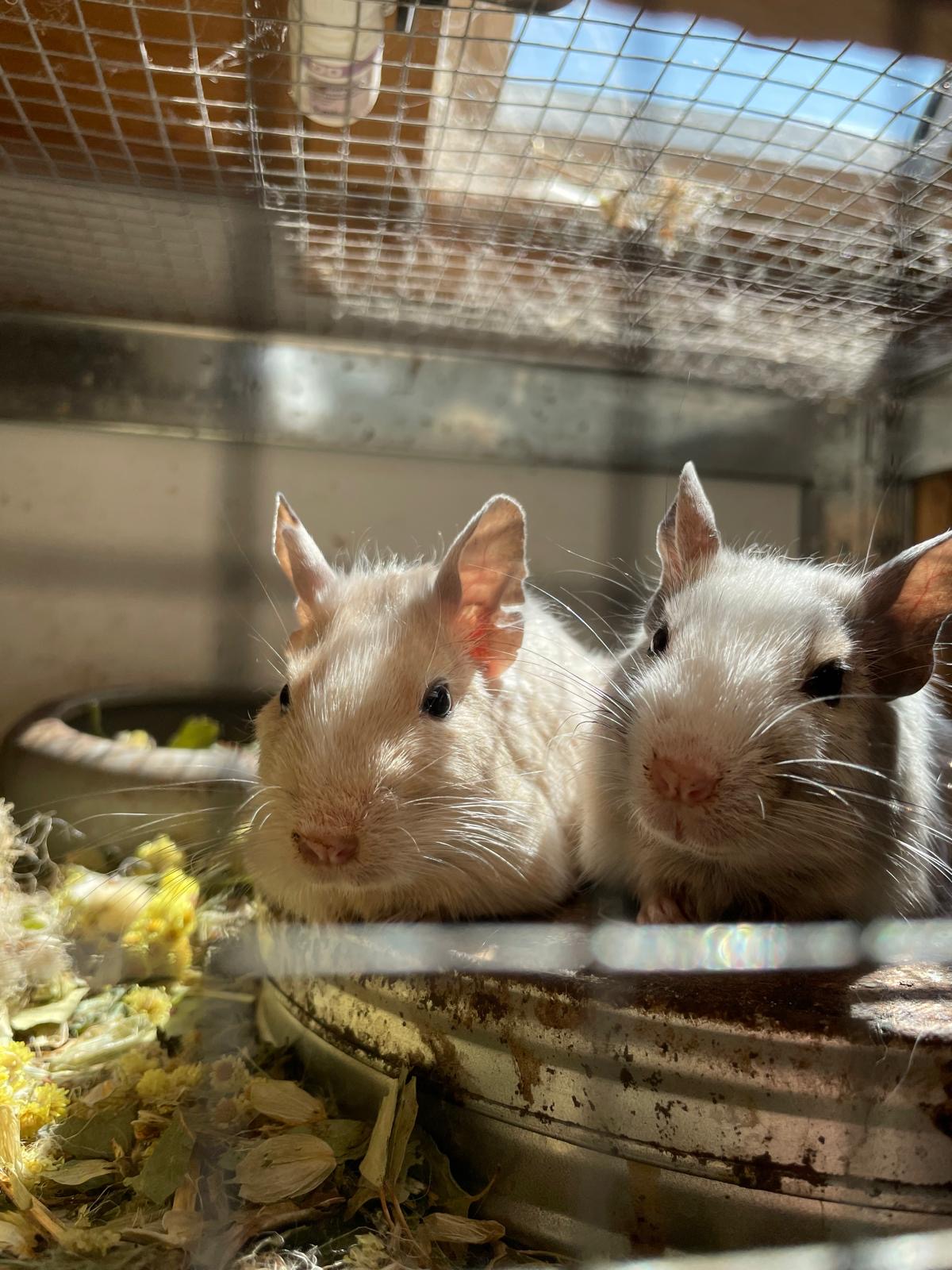 Abgesehen von Fantas schmaler Statur sind die drei gesund und munter. Fanta ist der Agouti, Seven weiß mit grauem Kopf und Gin weiß mit creme.