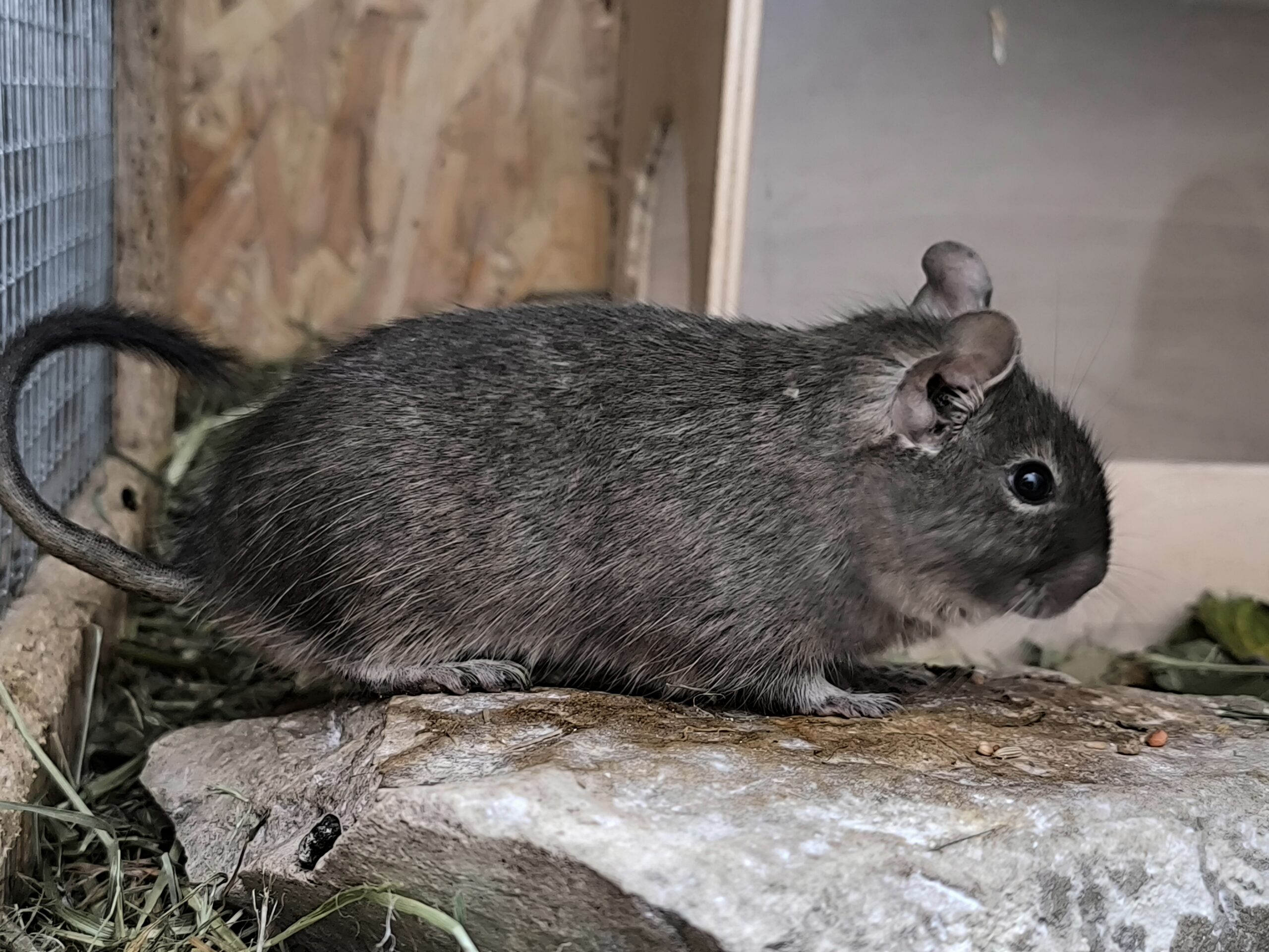 Er wurde am 26.06.2024 geboren, er ist gesundheitlich fit, neugierig und insgesamt in sehr gutem Zustand. Für einen Degu ist er ziemlich groß und kräftig gebaut. Charakterlich ist er eher etwas schreckhafter und beobachtend, aber ein lieber Kerl – in der Gruppe hat er sich umsichtig gezeigt und auch Fellpflege betrieben, aber die Chef-Rolle hat nicht zu ihm gepasst in der Gruppe.