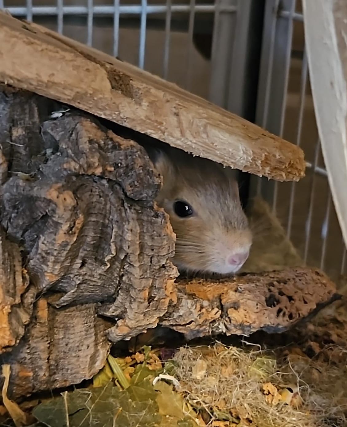 Tiffy ist gesund und munter, eher scheu, isst aber Leckerlis auch aus der Hand. Sie rennt gerne im Laufrad und liebt es, unter dem Rotlicht zu entspannen oder im Sand zu baden. Handzahm ist sie nicht, sie beißt aber auch nicht.