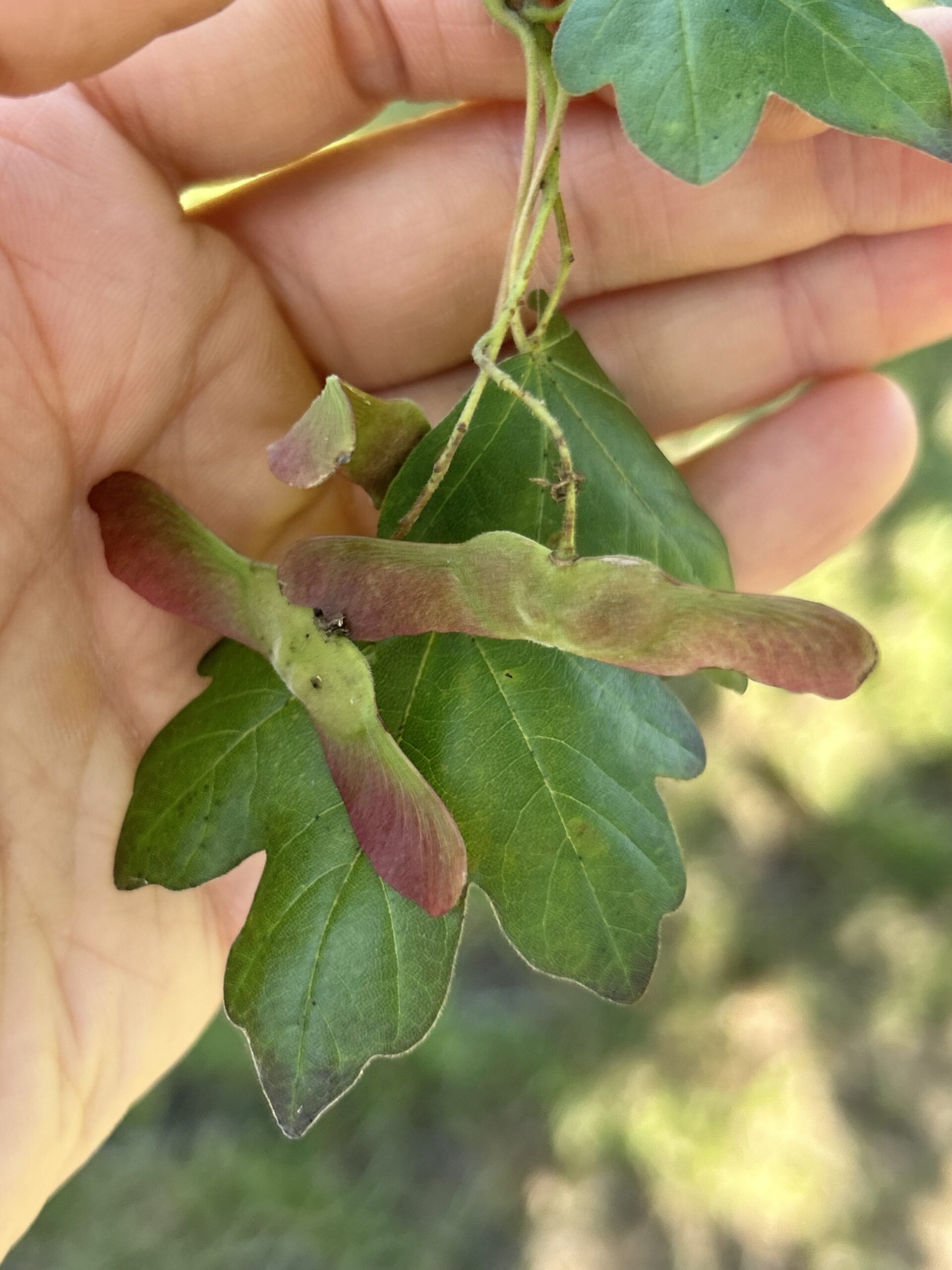 Französischer Ahorn (Acer monspessulanum) mit 3-lappigen, derben, meist nur bis zu 5 cm langen Blättern und V-förmigen Frucht Flügeln. Unproblematisch.