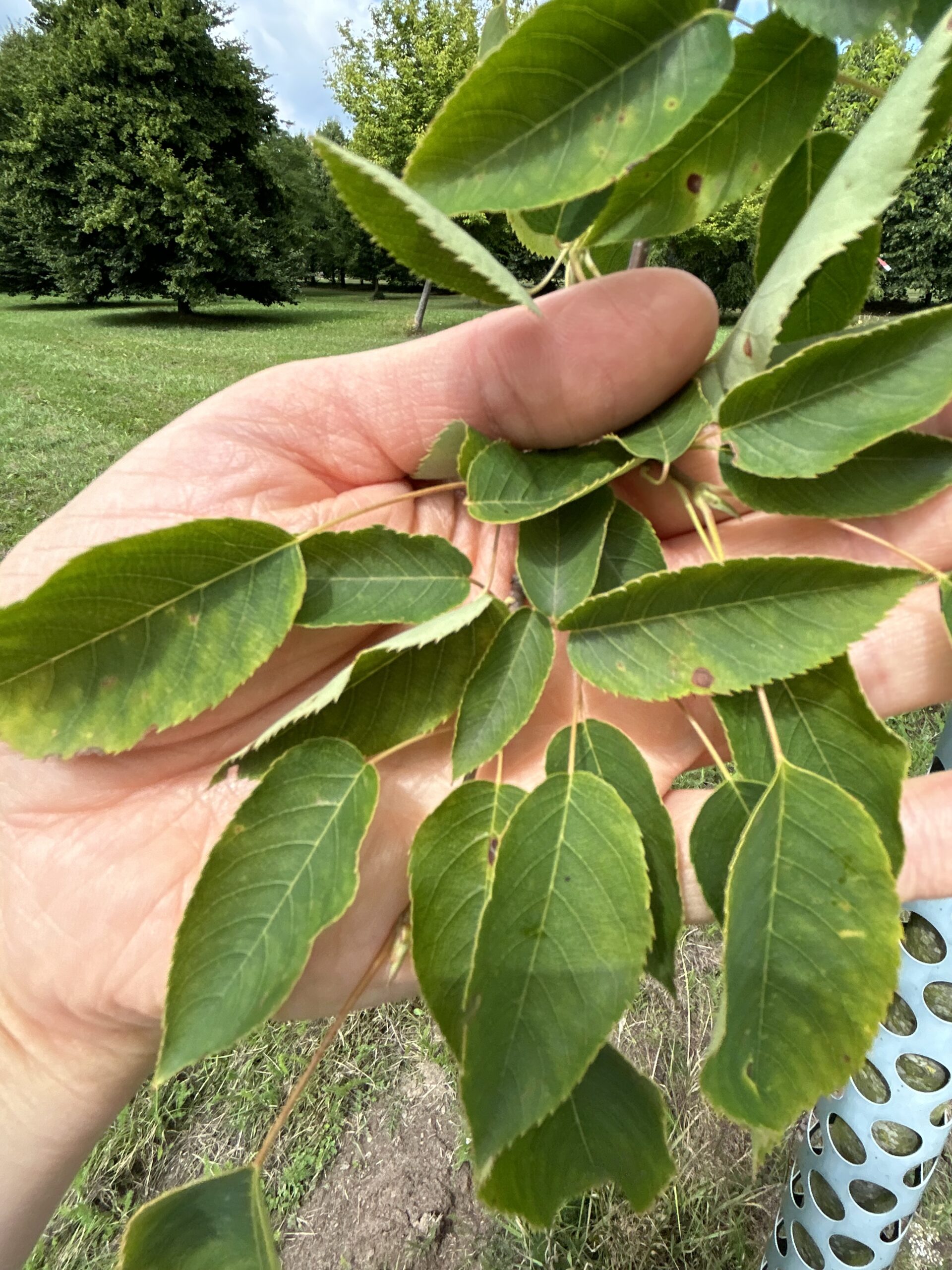 Blatt: Blattspreite (das ist der Blattkörper) 2-4 cm lang. Ovale, eiförmige Blätter (vgl. botanischen Namen), wechselständig mit fein gesägten Rändern. Beim Austrieb graufilzige Behaarung, später nur noch unterseits.