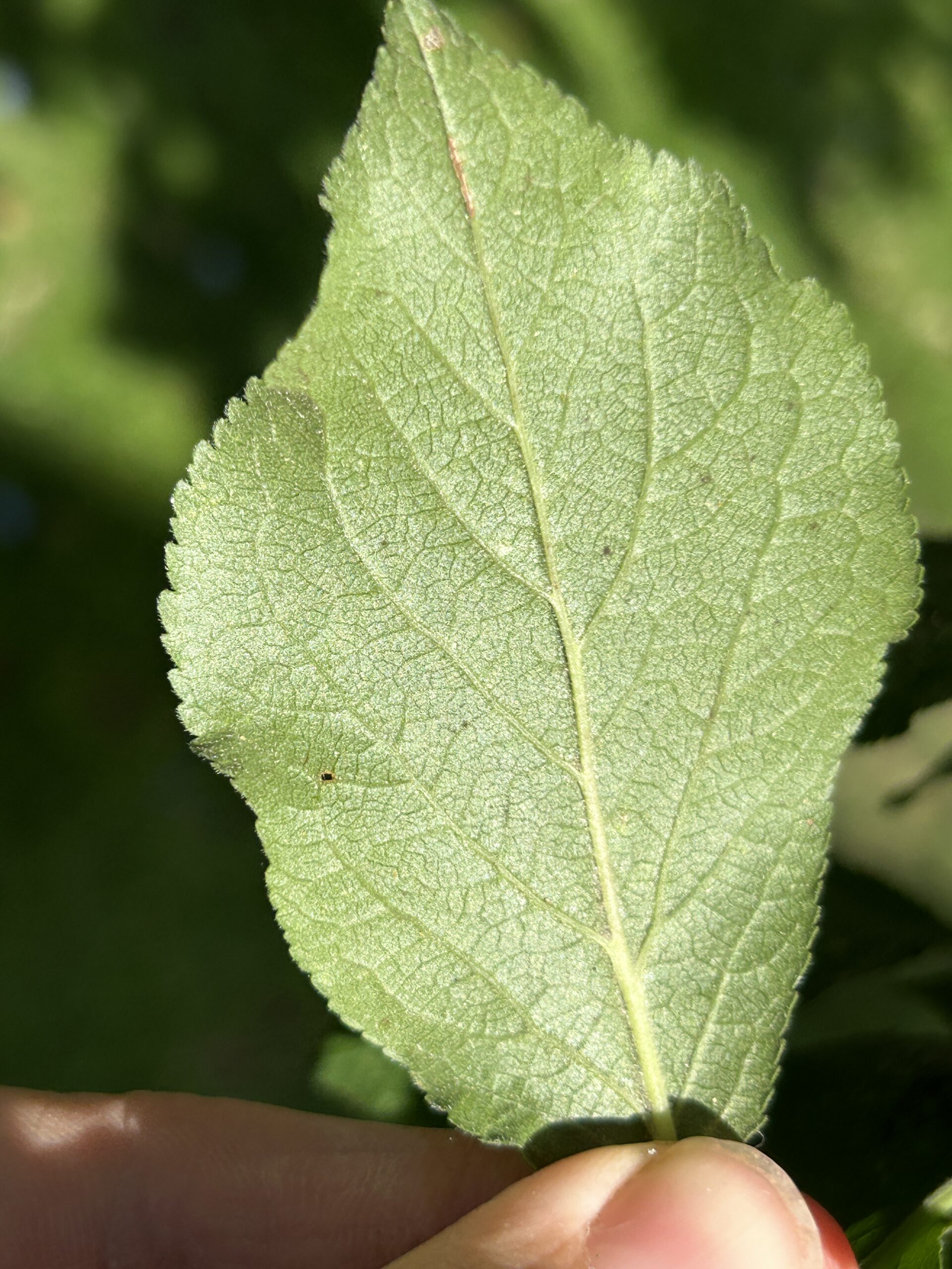 Blatt: Blätter 4-10 cm lang, wechselständig, eiförmig, oberseits kahl, unterseits mehr oder weniger behaart. Blattrand kerbig gesägt.