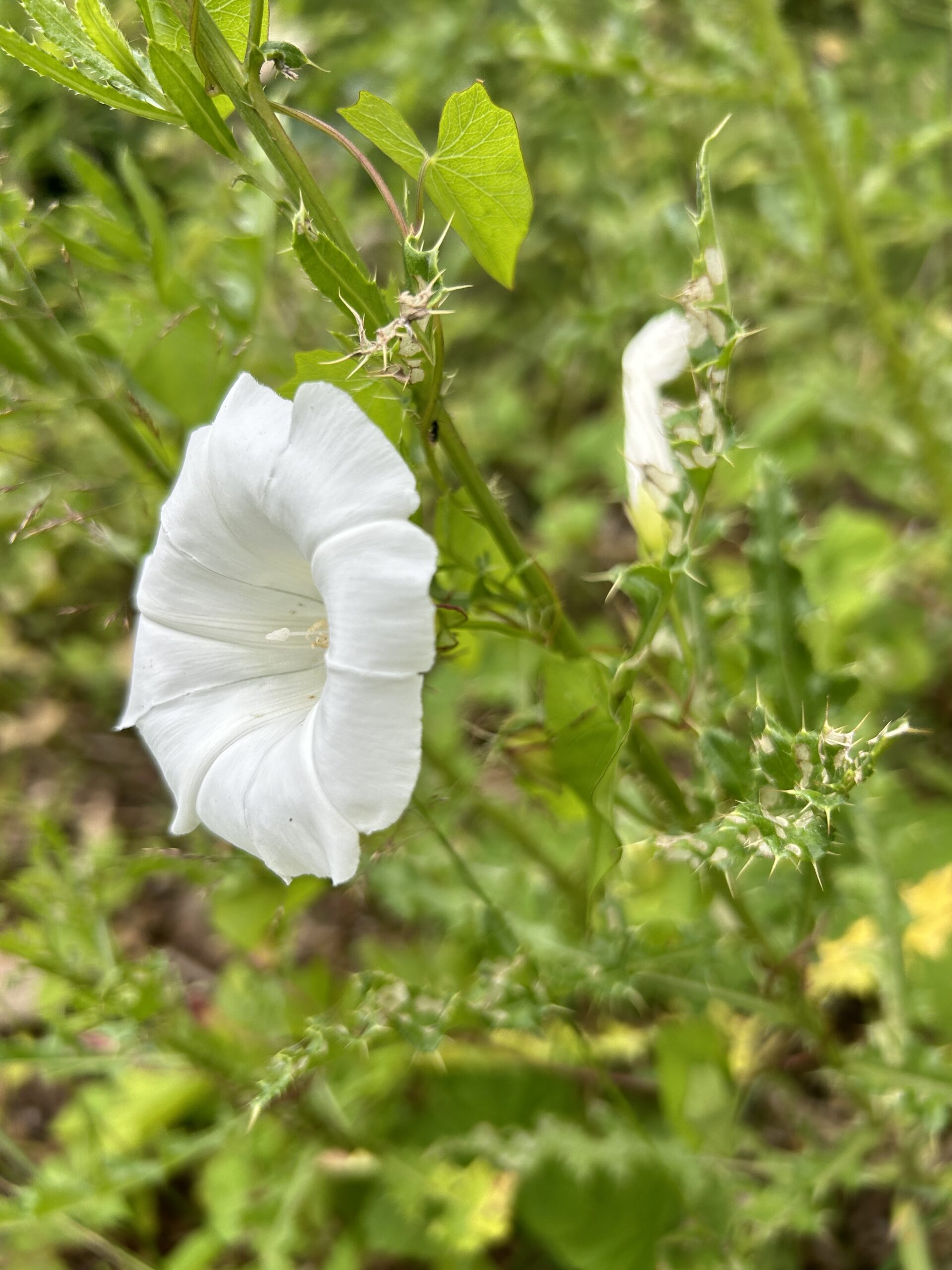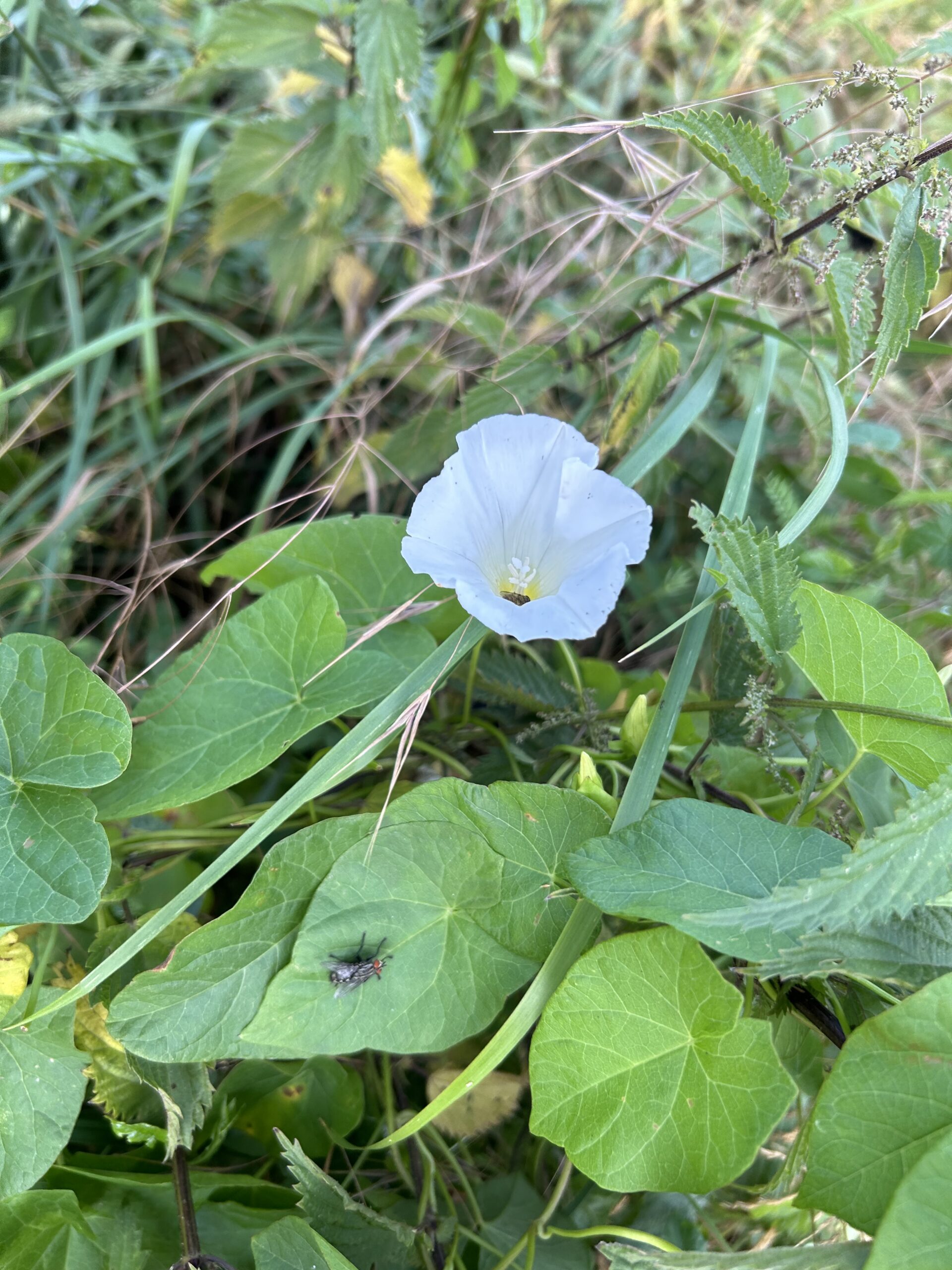 Blüte: Weiße (selten rosa gestreifte), weit trichterförmige und blattachselständige Blüten auf langen Stielen. Die großen Blüten sind bis 5 cm lang.