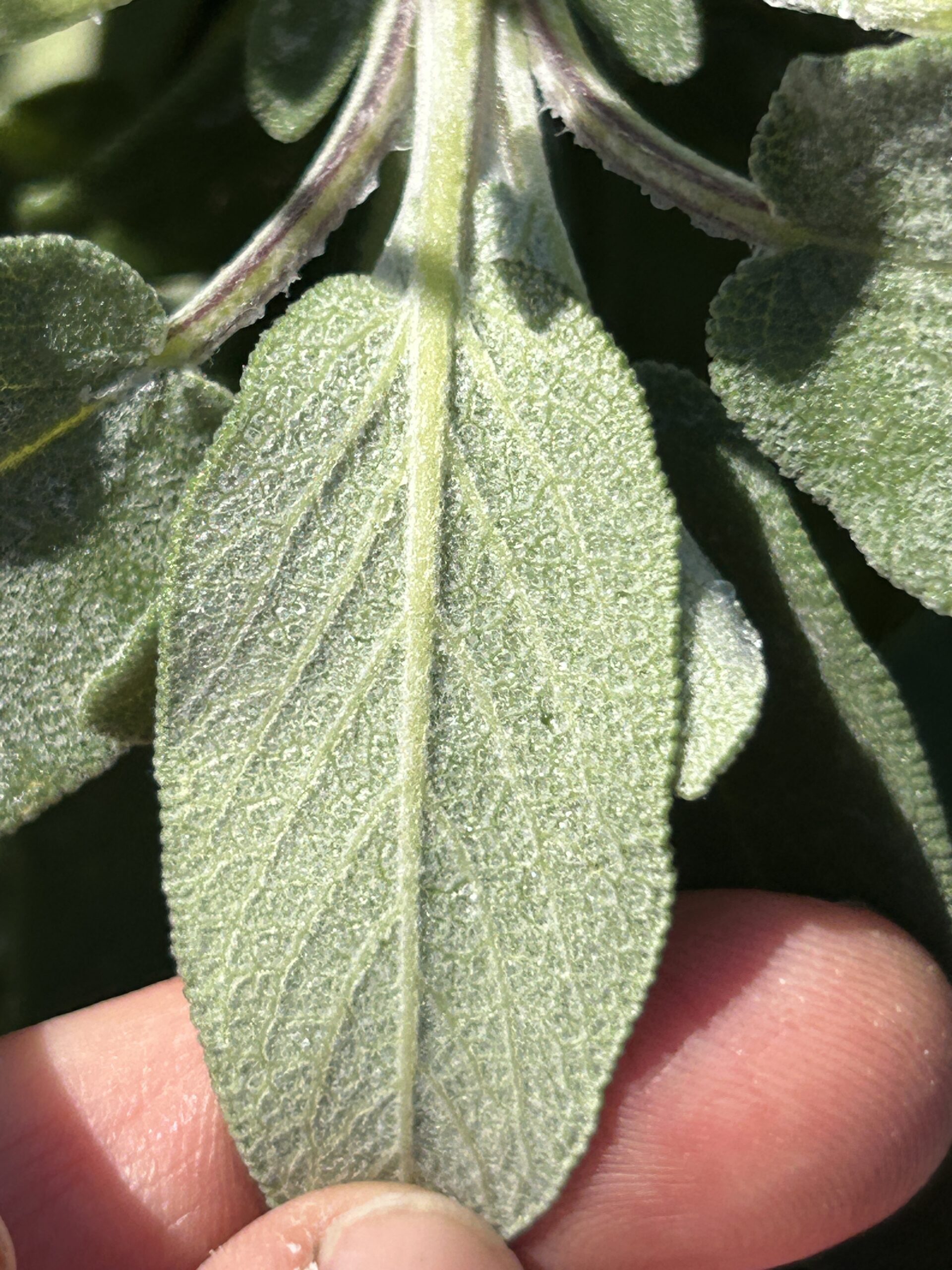 Blatt: Blätter runzelig, oval bis breit lanzettlich, gekreuzt gegenständig, graugrün, graufilzig mit 2 kleinen Zipfeln, zerrieben stark duftend.