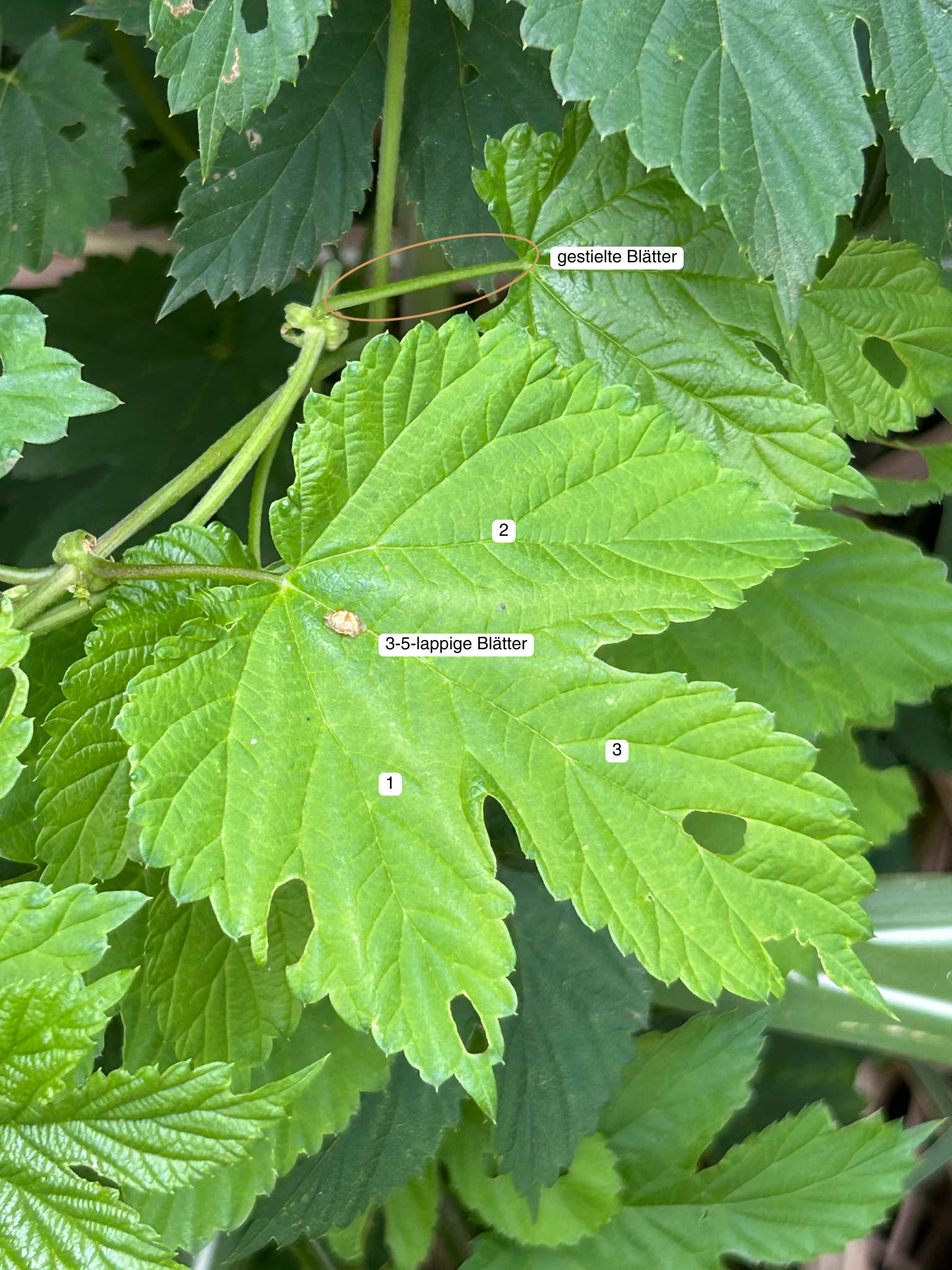 Blatt: Windende Kletterpflanze mit gegenständigen, gestielten, 3-5-lappig, rau behaarten und am Rand gezähnten Blättern.