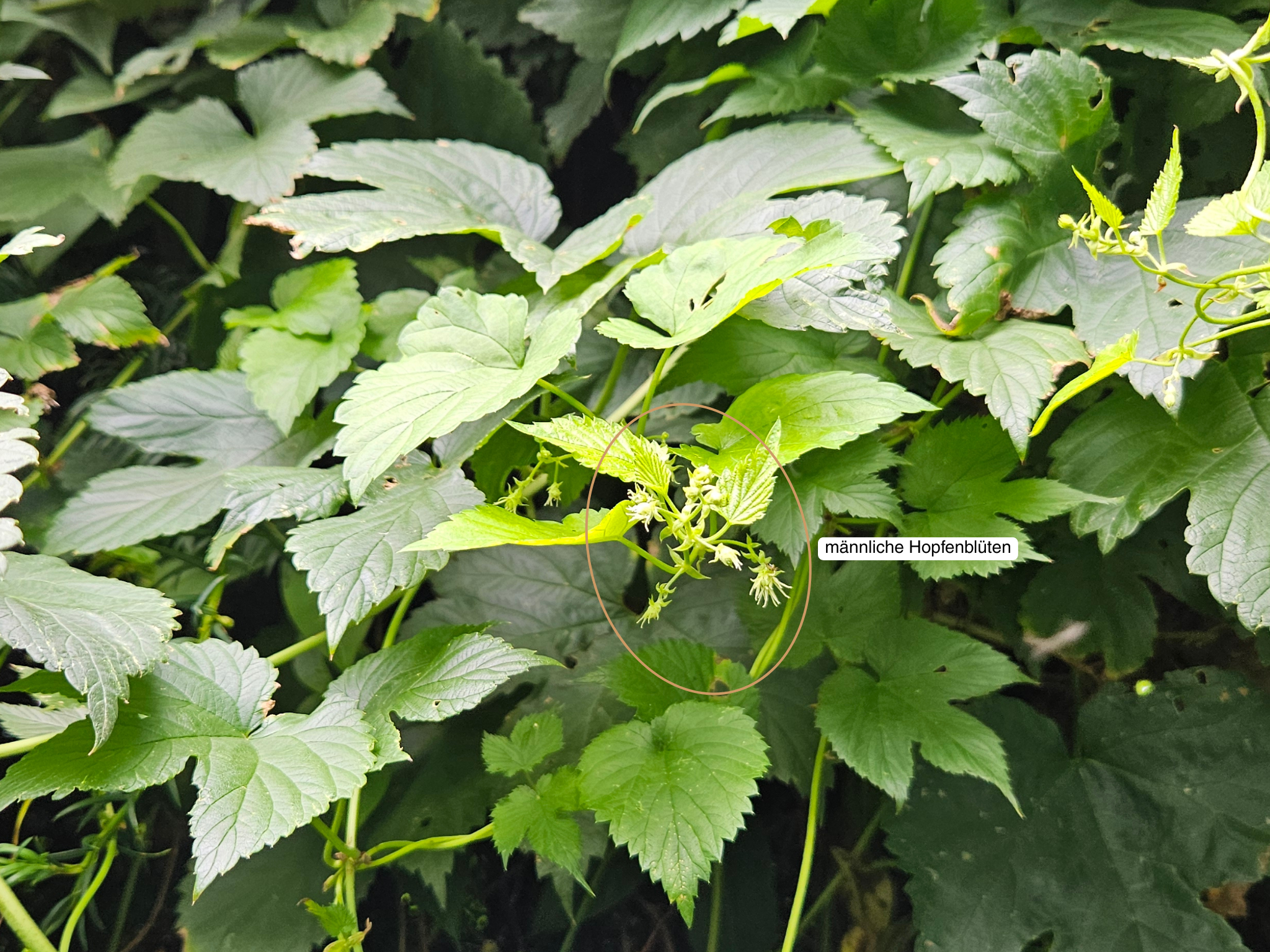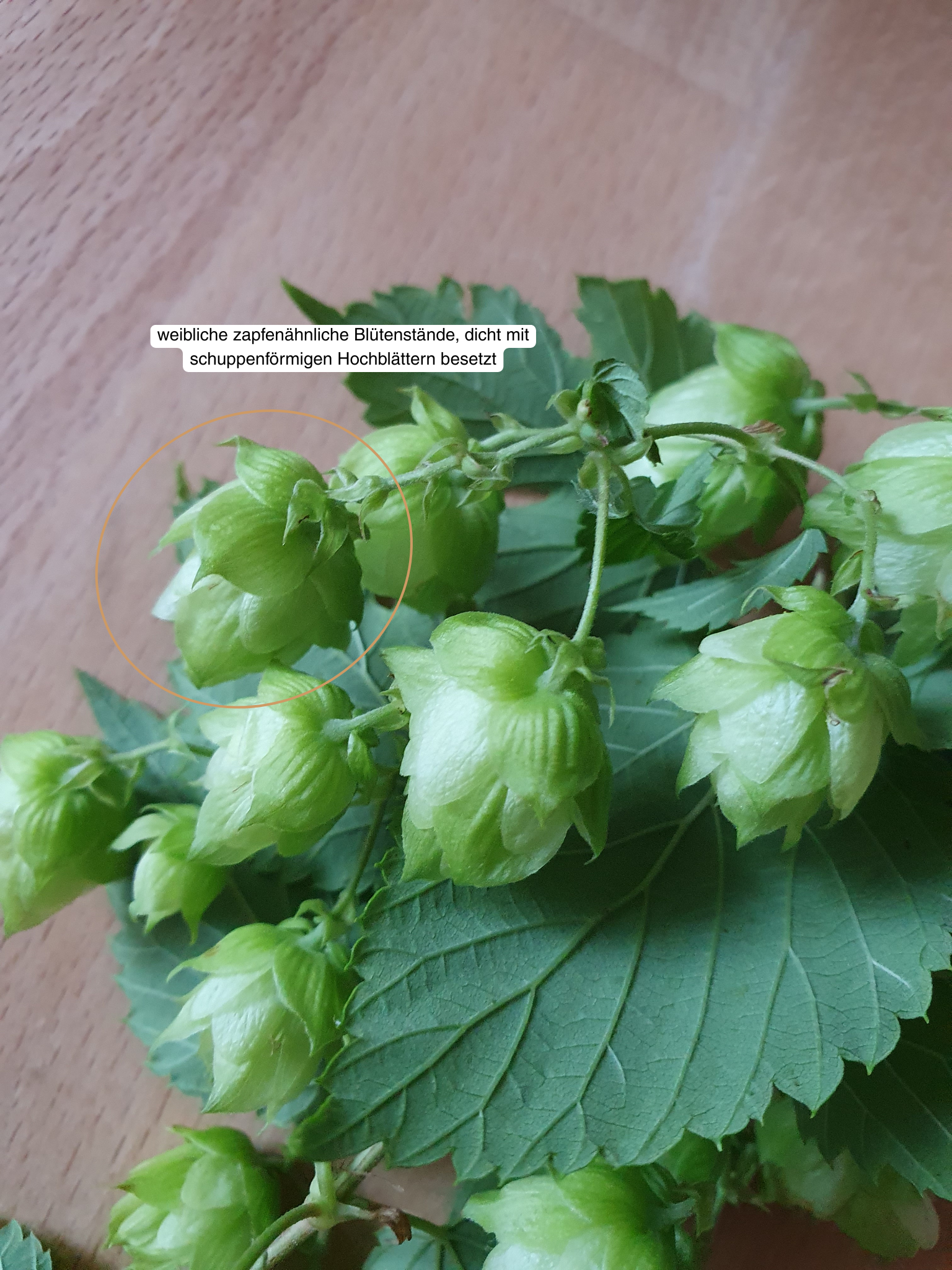 Blüte: Der Hopfen gehört zu den zweihäusig blühenden Gewächsen, d.h. an einer Pflanze erscheinen entweder nur männliche oder nur weibliche Blüten. Die hellgrünen männlichen Blütenrispen bleiben recht unauffällig. Markanter sind die weiblichen zapfenähnlichen Blütenstände, dicht mit schuppenförmigen Hochblättern besetzt. Anfangs sind sie gelbgrün, später verfärben sie sich bräunlich.