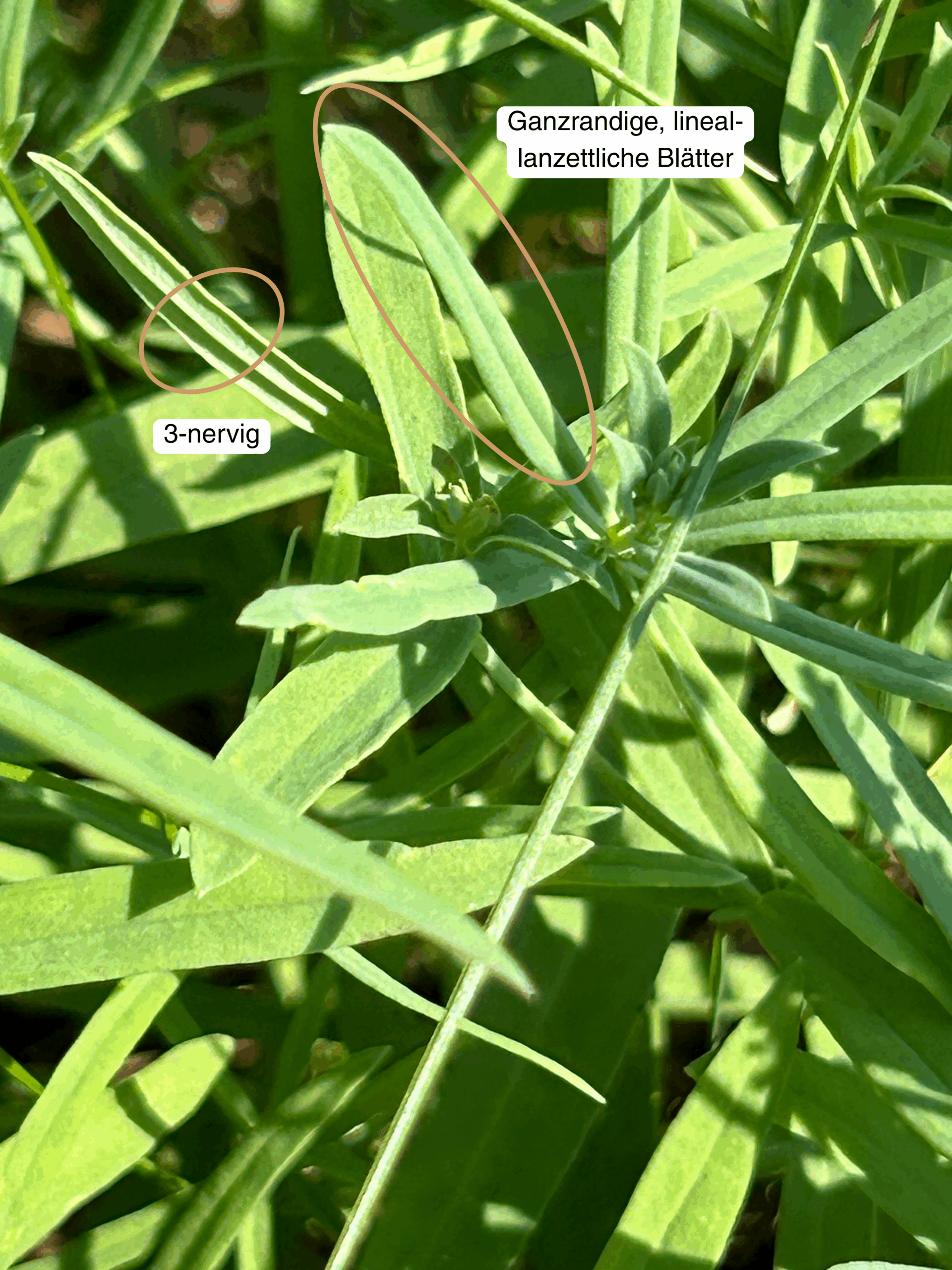 Blatt: Ganzrandige, lineal-lanzettliche, unbehaarte, bläuliche, unterseitig wachsartig-bereifte, ungestielte, sehr dicht sitzende, wechselständige 3-nervige, 2-5 cm lange Blätter.