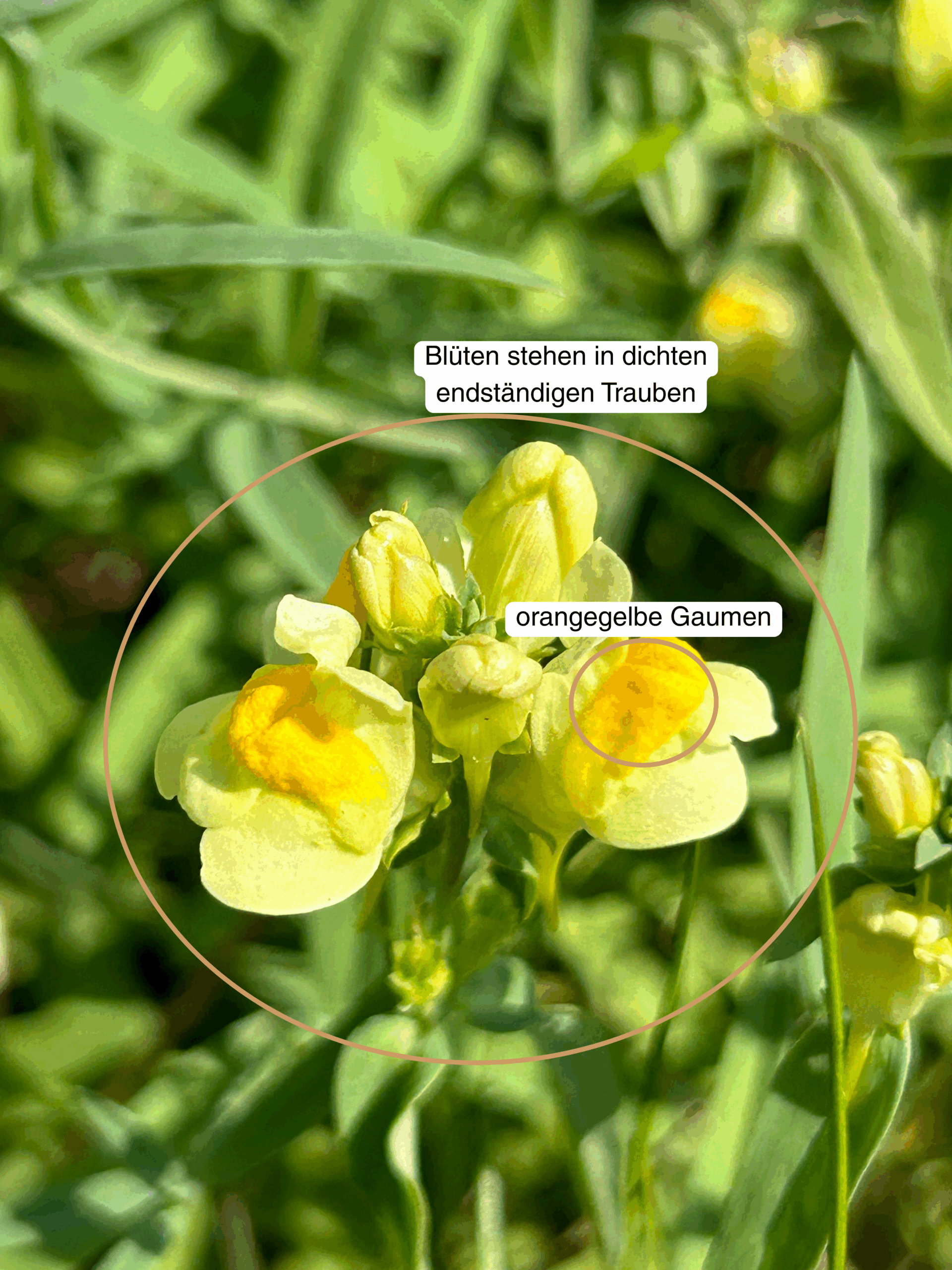 Blüte: Gestielte, hell-schwefelgelbe Blüten mit orangegelbem Gaumen. Sie sind 20-30 mm groß und stehen in dichten endständigen Trauben. Trauben zuerst kegelig, später verlängert.