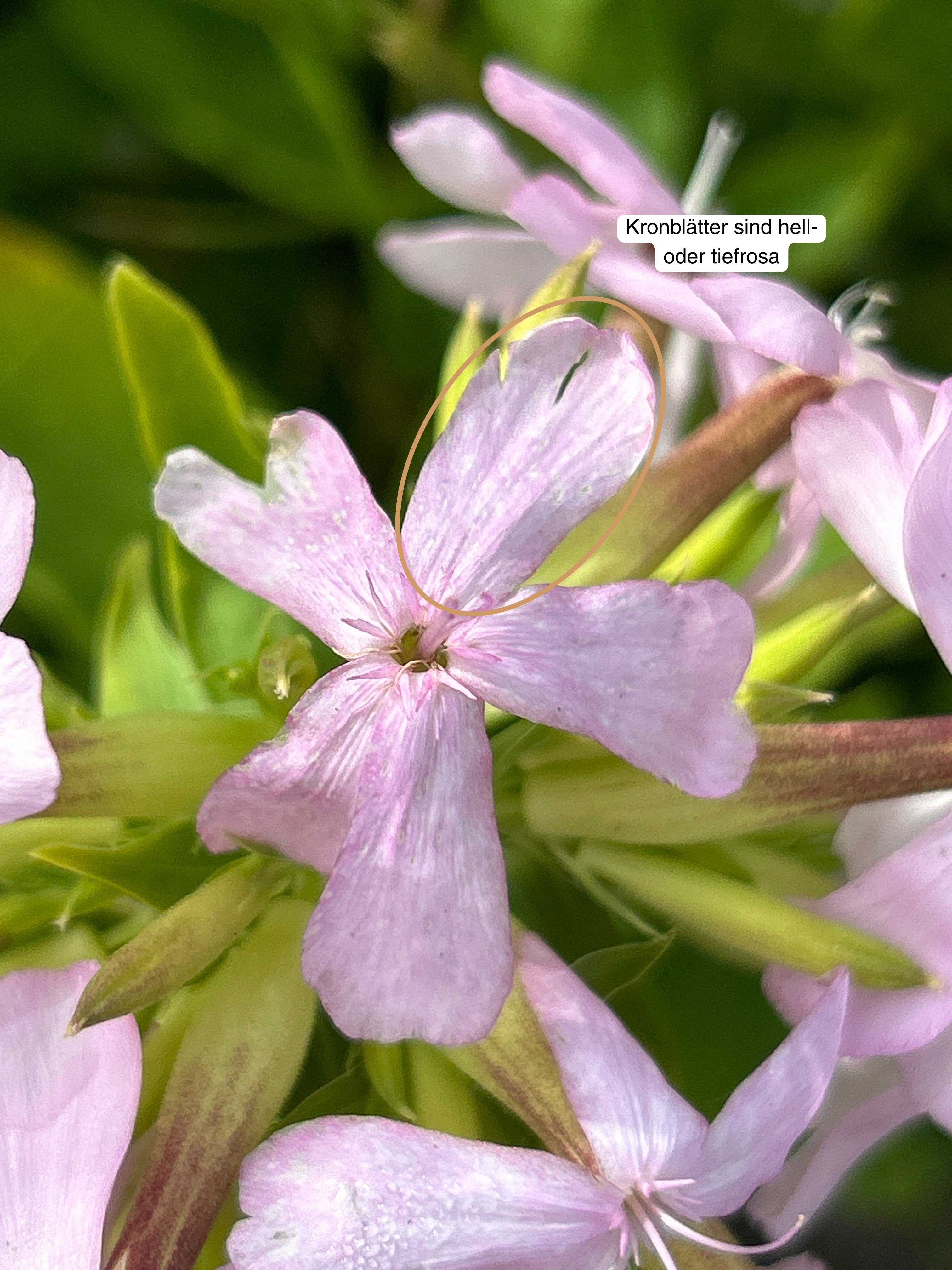 Blüte: Scheindolden mit bis zu 2,5 cm breiten Blüten, Kronblätter höchstens eingebuchtet. Kronblätter hell- oder tiefrosa, gelegentlich weiß. Kelch zylindrisch, 20-25 mm lang.
