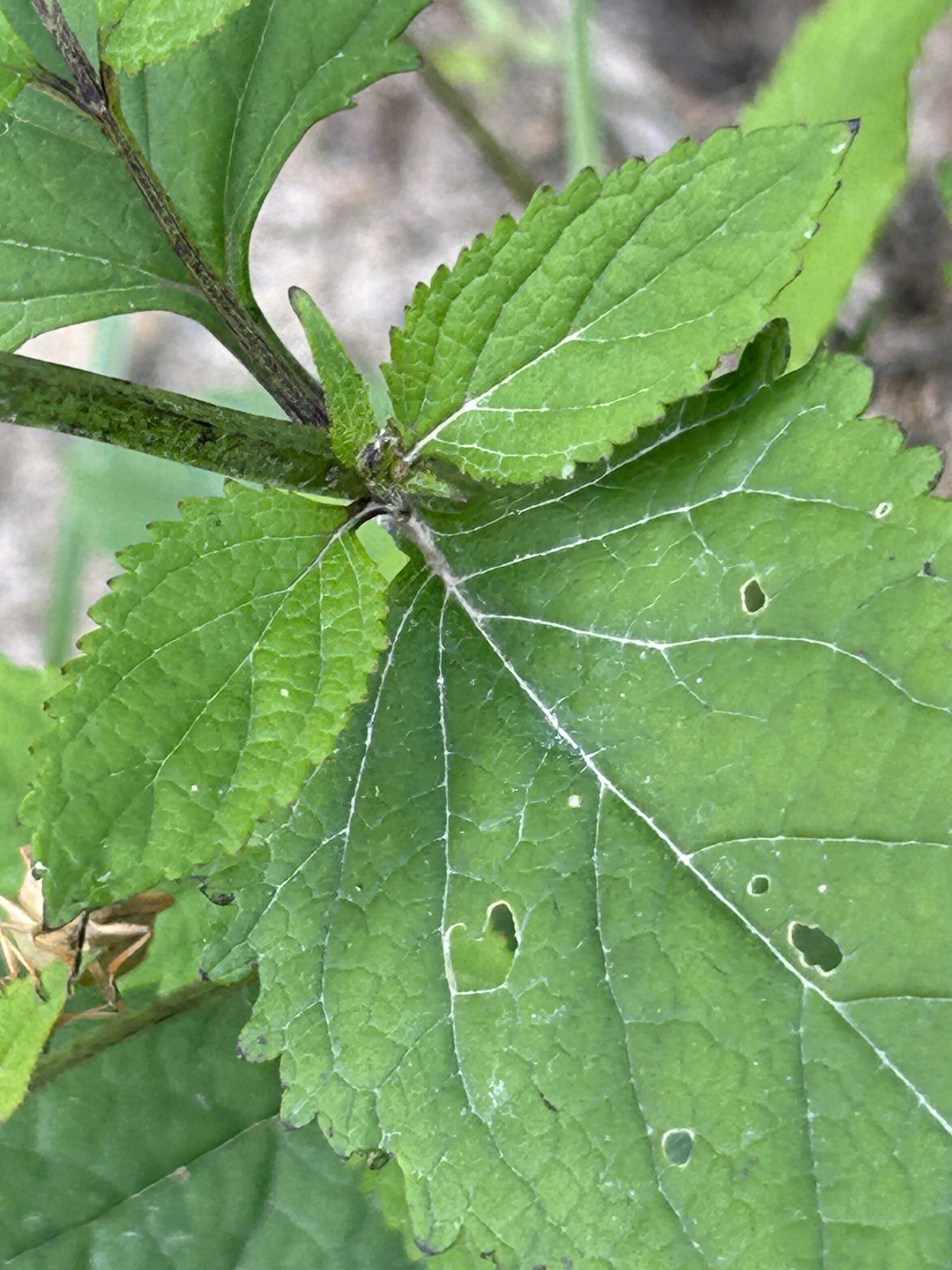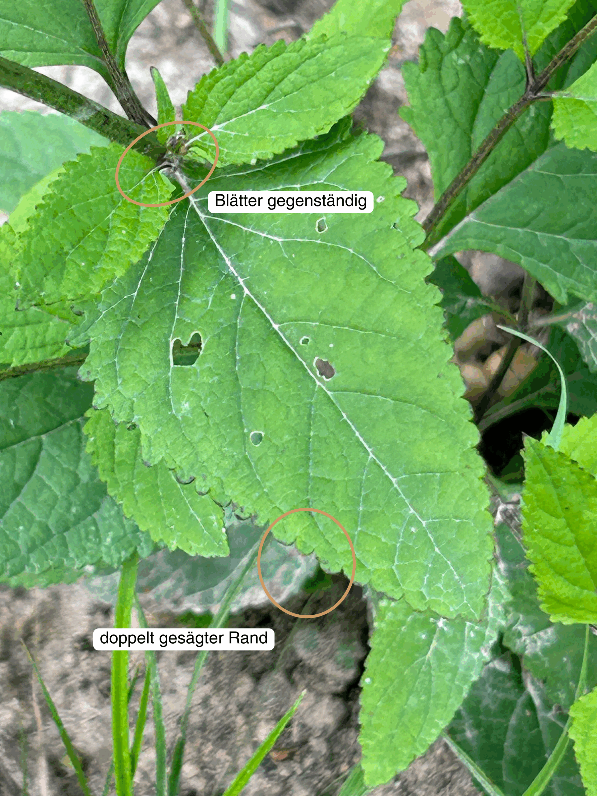 Blatt: 4-kantig gestielte, eiförmig-spitze, dunkelgrüne Blätter mit doppelt gesägtem Rand, Blätter gegenständig, untere herzförmig, obere eiförmig.