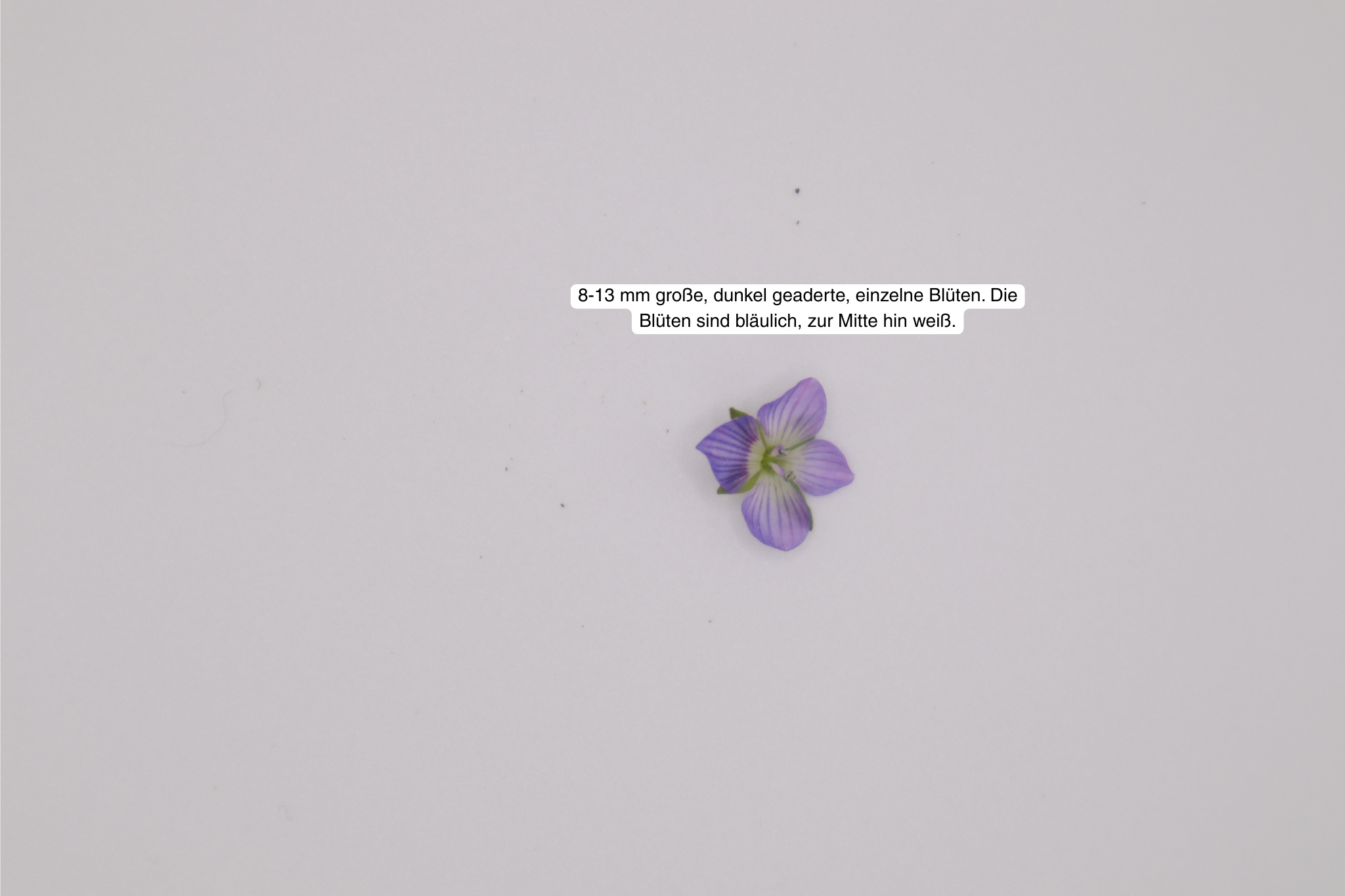 Blüte: 8-13 mm große, dunkel geaderte, einzelne Blüten. Hellblaue, im Schlund weiße Blüten einzeln auf 0,5-3 cm langen Stielen, weittrichterig bis radförmig.