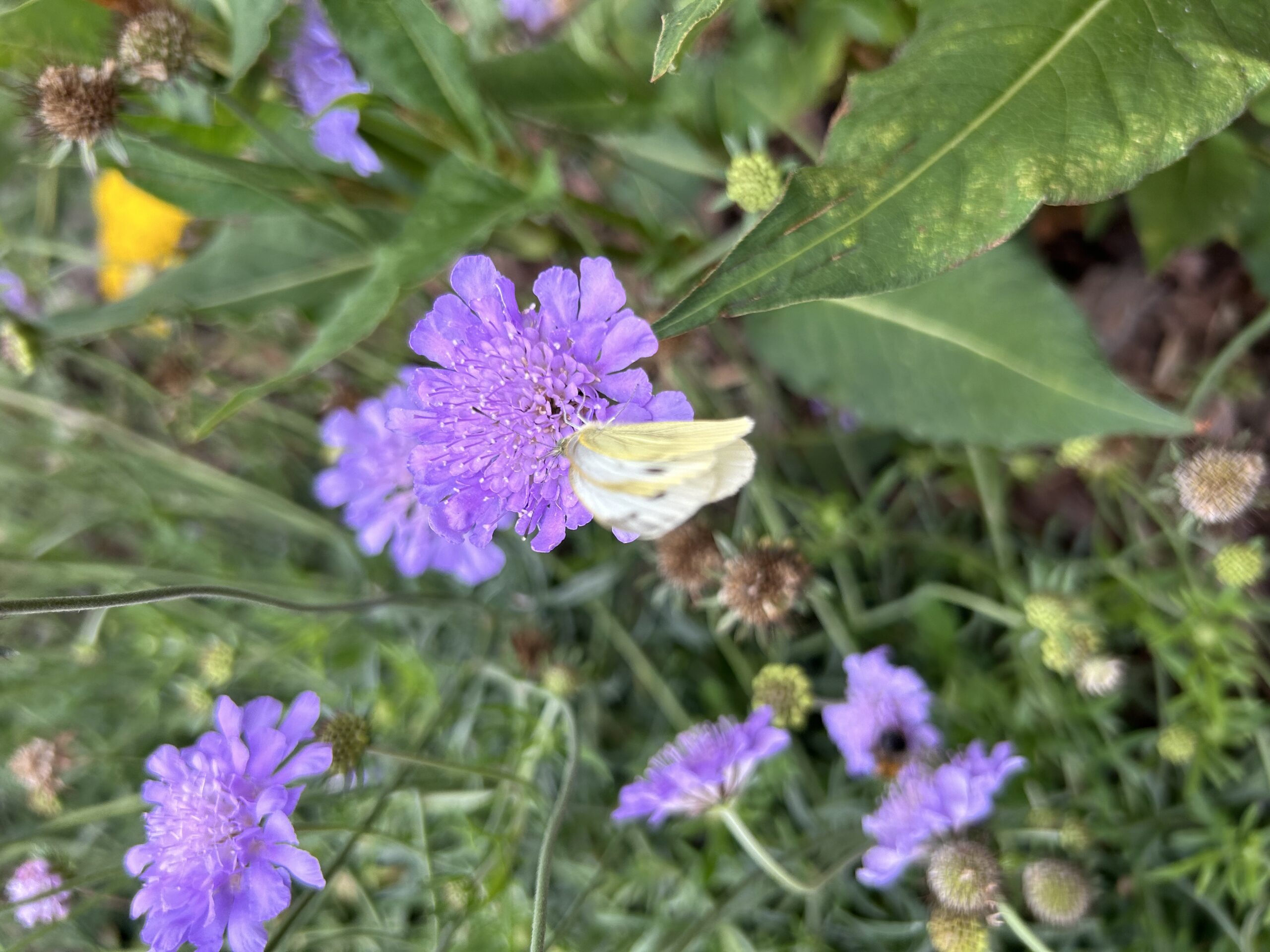Wiesen-Witwenblume (Knautia arvensis), Blüte 4-zipfelig, Kelch mit kurzen, hellen Borsten. Unproblematisch.