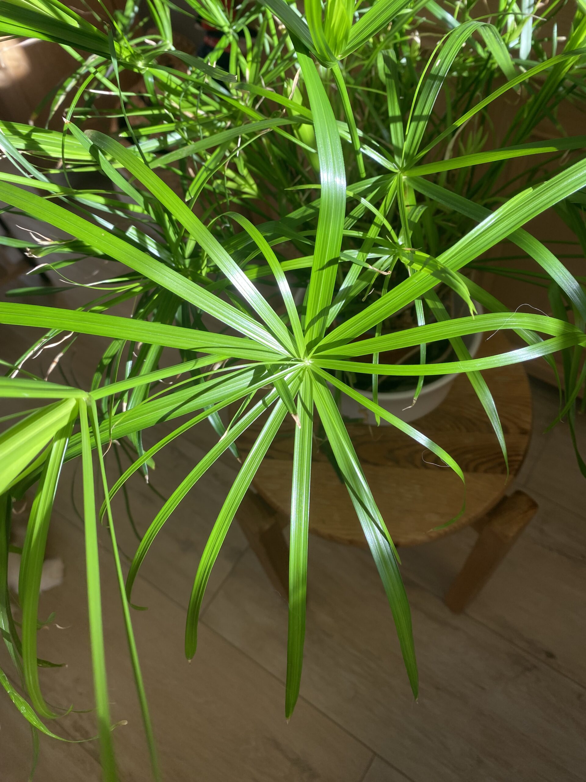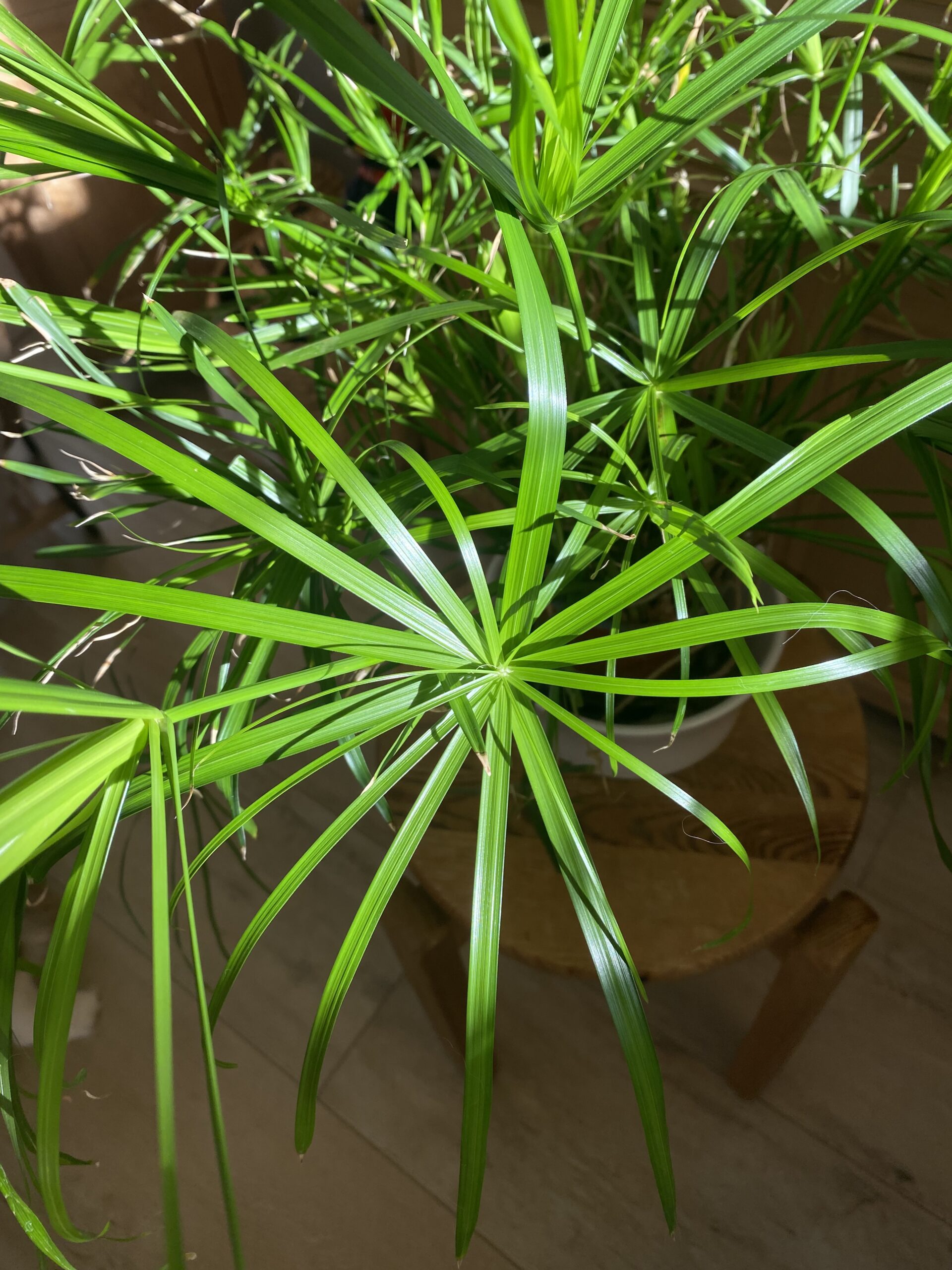 Cyperus ist eine große Gattung mit über 600 Arten. Bei zu trockener Umgebung werden die Spitzen braun, das Fehlen von frischen Trieben deutet auf zu wenig Licht hin.